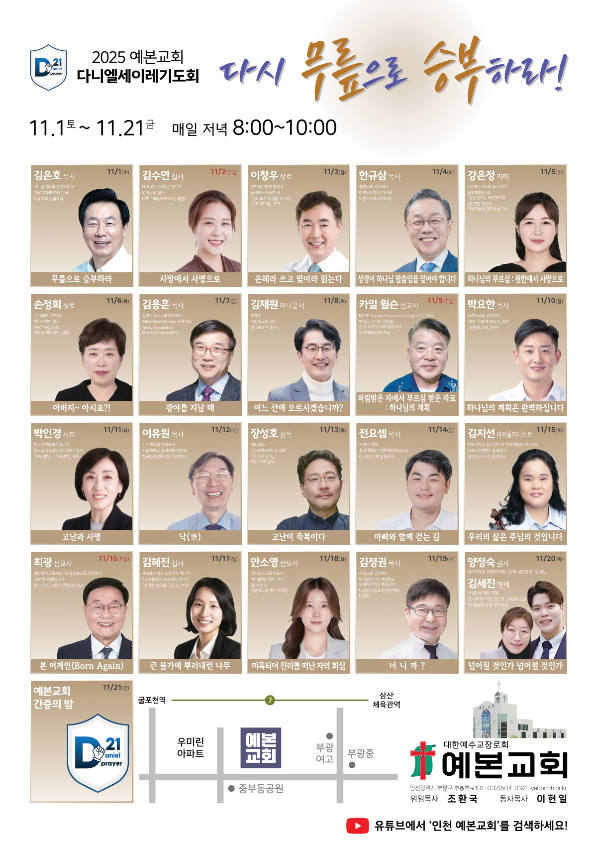 2025 다니엘세이레기도회 "다시 무릎으로 승부하라!" 페이지 정보 작성자 관리자 댓글 0건 조회 65회 작성일 25-10-07 11:28 본문 2025년 11월 1일(토)~21일(금) 매일 저녁 8~10시 예본교회 본당 목록 다음글2025 추석 가정예배 순서지 25.09.27